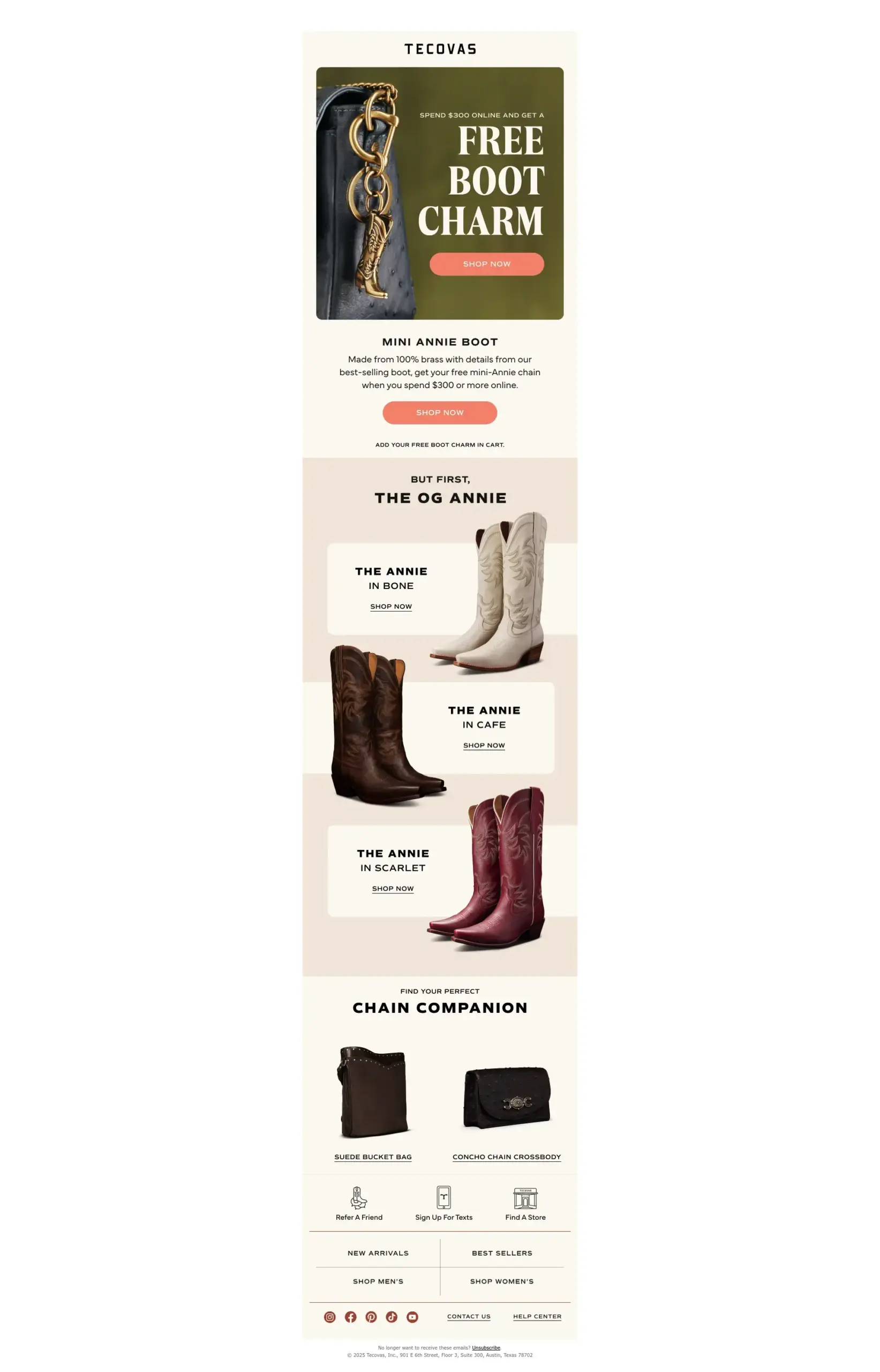 <div style="font-family:Verdana, Geneva, sans-serif;font-size:12px;font-style:normal;font-weight:400;letter-spacing:0px;line-height:1.3;text-align:center;color:#727272;"><div><span style="font-family: Verdana, Geneva, sans-serif; font-weight: 400; font-style: normal; font-size: 10px;">No longer want to receive these emails? <a class="unsubscribe-link" style="color:#000000;font-weight:normal;text-decoration:underline;" href="http://trk.tecovas.com/ls/click?upn=u001.BBAH9gTRsHlOwQSwIQU-2BEsNc8KHjfw0gn-2BlQ9Op4DcsRm6hzy6RyE3NHdnPp7iu3z6hQMZKwE2Zjm73c42WE-2F7EW-2FXEitRd0ChVee-2BM68rPyVcQ5fjWAvFS-2FzpENHNr5TVCTMuzAP4VdCZePCte4t4pm9mYnB3WVFfW2hzPQTHf-2BvC7tS0Wt6LYfCIuM-2BvTHVhHcQl-2Bt2i43ivwuEZ-2FRwhIK-2ByG0-2FhAIVl6SR0YZ-2Fr-2FDNnnyQDZQB5SDeTb-2BwO-2F0xdzmJVMsDDcaTH4H0AQAEw-3D-3DaWjm_Xjf7LSH36rY7QB0v18OLzphNjeTPur-2B-2Bl1ucVHQuRAjvrlnVyNe-2Fpq87dBBw-2F7t-2BvO8SzC7vyVS1O5jS9ohzuN1qZypaYm-2BSy-2BKiuh14qI-2FvLqEOoFVoL0ZZJqOZF9oVG3PHzifyWgNUX5KjsP9g08XqVvsiKsvHApgWFsb1NFAHtz4wSqUhx0ghPfz9iKPt-2Fc-2Fb25fL0aBChEWqpxJd-2BjDjzmCqm6wDKKqgU08iFSIzOcShhwkb5WQv-2Fnk9M-2FKww18o0zLxOXUEJY-2FNPP4GlCxJXp6rGyJifJta0zRfU-2F9V3czjWQfRmGFJ3N4ODAAxlPoyat3CXiQyK7UxQURBV94feo94AADklMWFn-2BgY4t-2FXuYwNnW4DDp5hsSNnV6JFjN6WvnfrT6mmPmYPYsAplzu76tZNOYtuB9dhv3SP-2B8k3HqwB9Swo2kPmOVfAYuAJMdaWb6zPZ7jiXVjXyvAMx4TOgkr7tq86-2F0zSOJ4BYNBieDDMp9wz4DmhWcVaFmu9KXTGWP5wBAckNZF-2BTHKkbwzXM1knlO7Nf2J60InmKnKPEyYuAksrtfdsnNc4ihD-2F">Unsubscribe</a>.</span><br><span style="font-size: 10px;">© 2025 Tecovas, Inc., 901 E 6th Street, Floor 3, Suite 300, Austin, Texas 78702</span></div></div>